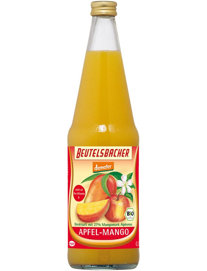 З багатьох сортів манго ми в першу чергу обираємо особливо ароматний сорт Альфонсо. Манго походить від окремих проектів екологічного розвитку в Індії. Приблизно 4 манго на літр пресують у щойно зібрану м’якоть манго для цього смачного рецепту. Доповнений яблучним соком Demeter, ми виробляємо це насичене задоволення від пиття. Особлива порада: яблуко-манго, розлите у форму, а потім заморожене, з м’якоттю дуже смакує як морозиво. Вітамін А сприяє підтримці нормальної сили моря та нормальної функції імунної системи.