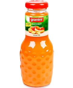 Склад: сік з концентратів: яблуко, апельсин, груша, ананас, маракуйя; вода; цукор; пюре мангове з концентрату; пюре бананове, пюре персика; регулятор кислотності: лимонна кислота; вітаміни C, B3, E, B5; бета-каротин, вітаміни B1, B9, B8 та B12. Сік Granini Мультифруктовий 100% — це...