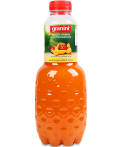 Склад: сік з концентратів: яблуко, апельсин, груша, ананас, маракуйя; вода; цукор; пюре мангове з концентрату; пюре бананове, пюре персика; регулятор кислотності: лимонна кислота; вітаміни C, B3, E, B5; бета-каротин, вітаміни B1, B9, B8 та B12. Вміст фруктів 50%. Нектар Granini Мультифруктовий...