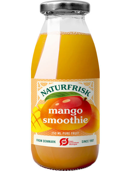 Mango Smoothie від Naturfrisk містить чудові органічні фрукти, такі як манго, банан, апельсин, яблуко та лимон. Результат – вишуканий, екзотичний, солодкий смак, який змусить вас мріяти про теплі краї. Чистий плід і чиста совість.