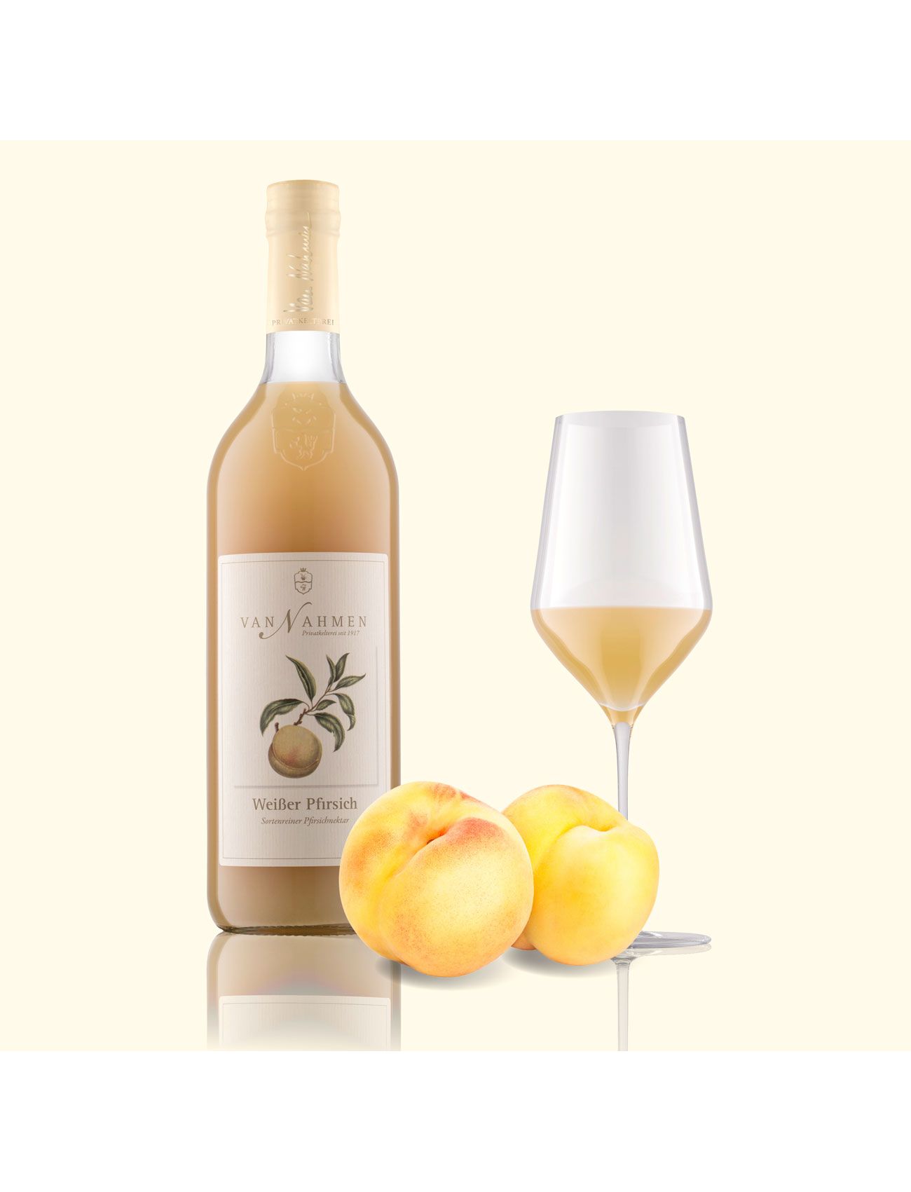 Сік для цього персикового нектару отримують виключно з сорту Білий персик. Цей сорт персика характеризується дуже насиченим ароматом і насиченим смаком. Наші повністю стиглі та ароматні білі персики надходять від наших фермерів з Італії. Завдяки індивідуальній техніці аграрії збирають лише придатні для врожаю плоди. Це гарантує незмінно високу якість нашої продукції. Наш нектар з білого персика має вміст фруктів не менше 50%.