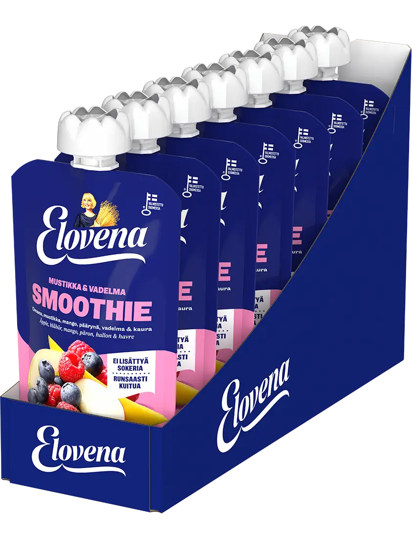 Новий пакетик для смузі Elovena Чорниця та Малина – це натуральний та корисний перекус для насиченого життя. Цей ягідний смузі виготовлено у Фінляндії з яблук, чорниці, манго, груші, малини та фінського вівса. Він містить багато клітковини та не містить доданого цукру. З цим зручним смузі-перекусом ви можете легко насолодитися денною нормою фруктів, куди б ви не пішли.