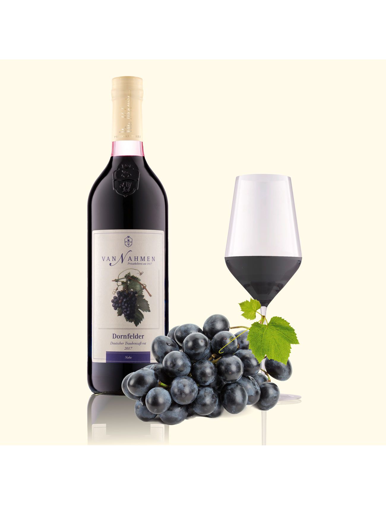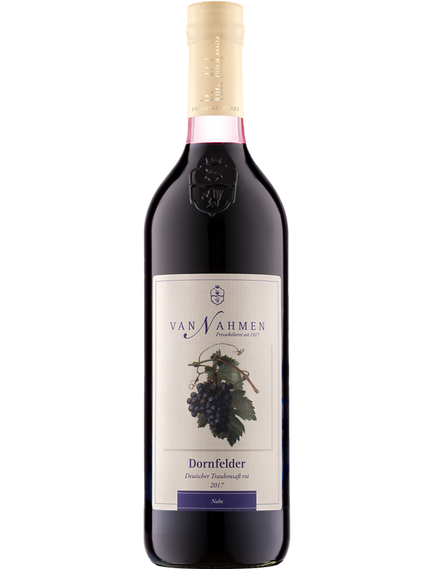 Потужна текстура сорту «Дорнфельдер» особливо добре передає аромати винограду соку (71°Oechsle). Наші виноградні соки високої якості з хорошим потенціалом для розвитку. Дозріваючи в пляшці, сік виділяє надлишок кислоти у формі так званого «винного каменю» — осаду. Цей осад залишиться на дні пляшки, якщо акуратно зливати сік.