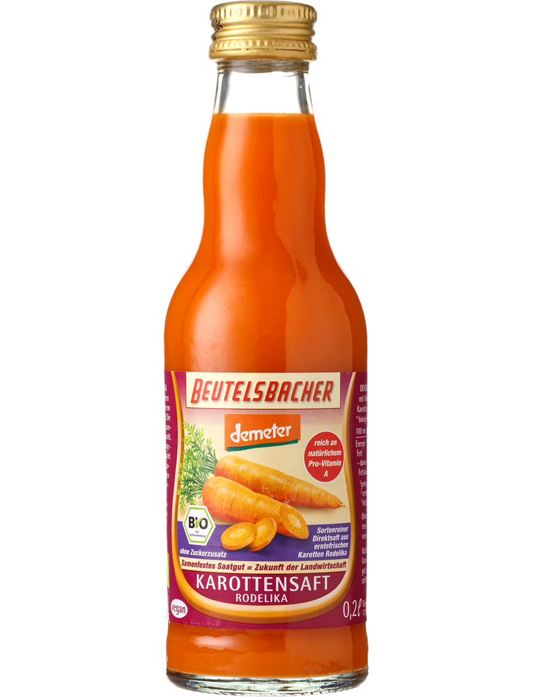 Морквяний сік зі свіжозібраною морквою Роделіка з біодинамічно вирощеного твердого насіння (не з гібридного насіння). Суперечливі гібриди походять від одноразового схрещування, тобто від повторного штучного інбридингу. Вони непридатні для сільськогосподарського насінництва, оскільки їхні властивості не відтворюються. Тому ми пропонуємо прямий сік із твердої моркви. Роделіка без кісточок — це велика морква з гладкою шкіркою інтенсивного оранжево-червоного кольору та сильним солодким ароматним смаком. Купуючи, ви сприяєте подальшому розвитку вирощування та насінництва стійких до насіння сортів. Порада: 0,1 л покриває рекомендовану добову дозу вітаміну А. До речі, морквяний сік також використовують для догляду за шкірою через високий вміст бета-каротину.