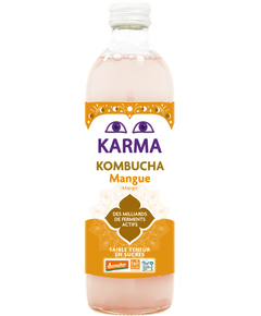 Склад: Karma Kombucha 95% (фільтрована вода, органічний тростинний цукор з Парагваю (перетворений під час бродіння), органічний зелений чай з регіону Хубей, органічна культура чайного гриба (бактерії та дріжджі)), органічне манго 5%.