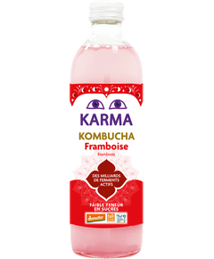 Склад:  Karma Kombucha 97% (фільтрована вода, світлий тростинний цукор з Парагваю, зелений чай Індії, культура чайного гриба), настій гібіскуса, аромат малини.