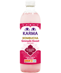 Склад:  Karma Kombucha (фільтрована вода, світлий тростинний цукор, зелений чай, культура чайного гриба), настій гібіскуса, гранатовий сік 14%, малинове пюре, сік імбиру, добірна жива культура.
