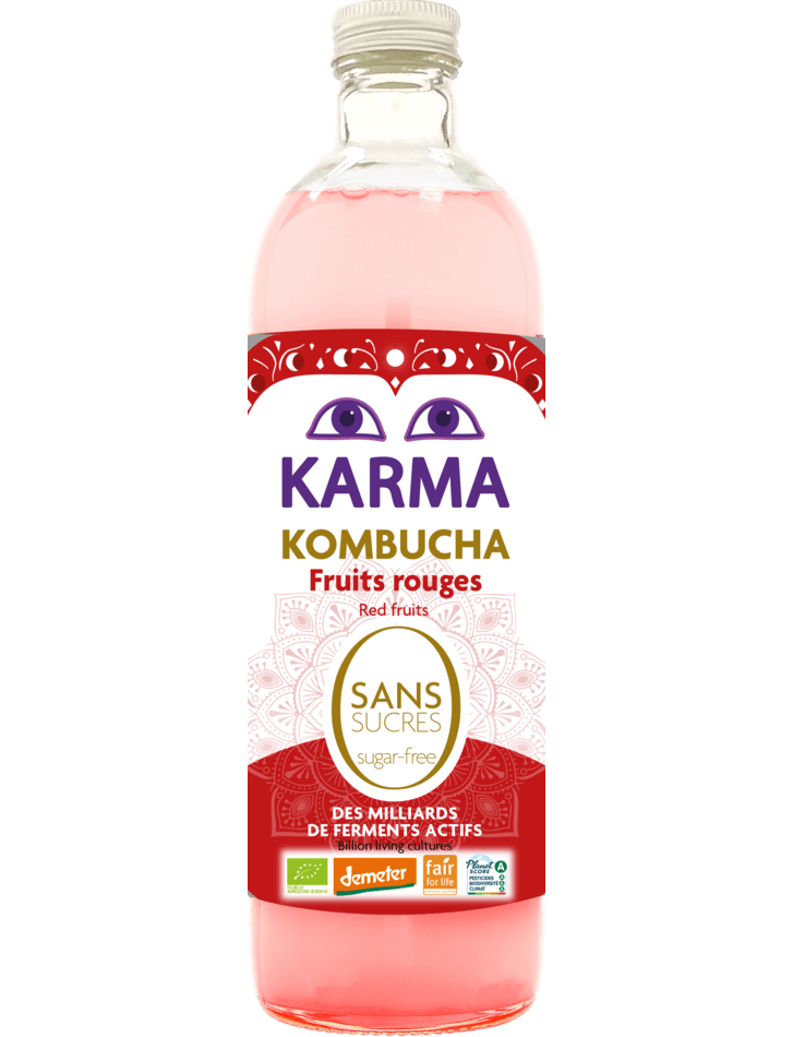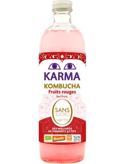Склад: комбуча* (вода питна фільтрована, цукор світлий тростинний * (нейтралізується в процесі ферментації), чай зелений *, чай чорний*, культури комбуча (бактерії та дріжджі)), фрукти* 2% (пюре з чорної смородини*, пюре з малини*, пюре з полуниці*), настій гібіскуса (вода питна, квіти гібіскуса*), настій листя стевії* (вода питна, листя стевії*),* ароматизатор малини та полуниці натуральний, культура.відібрана жива. * - органічного виробництва. Містить сліди спирту (<1.2% об.)