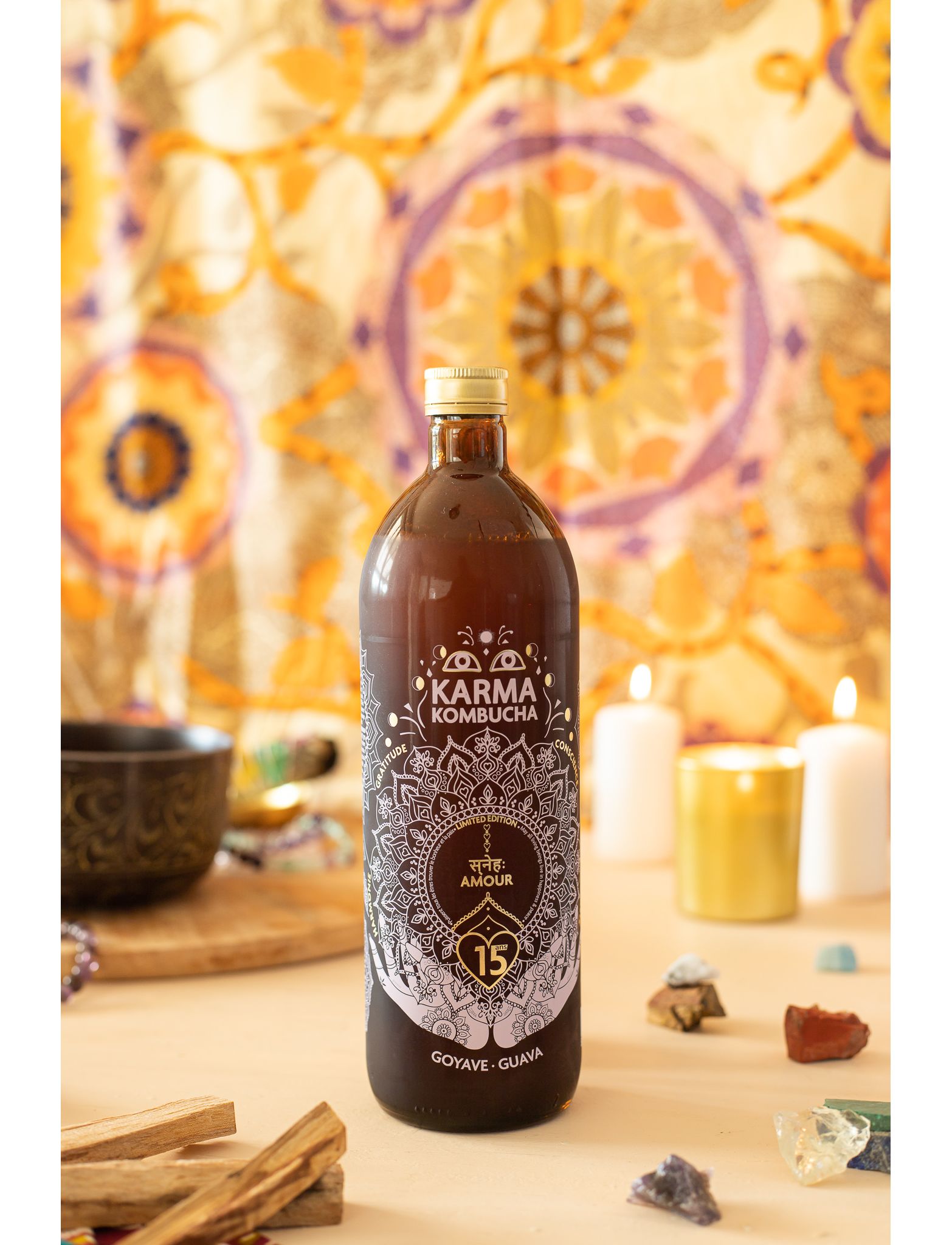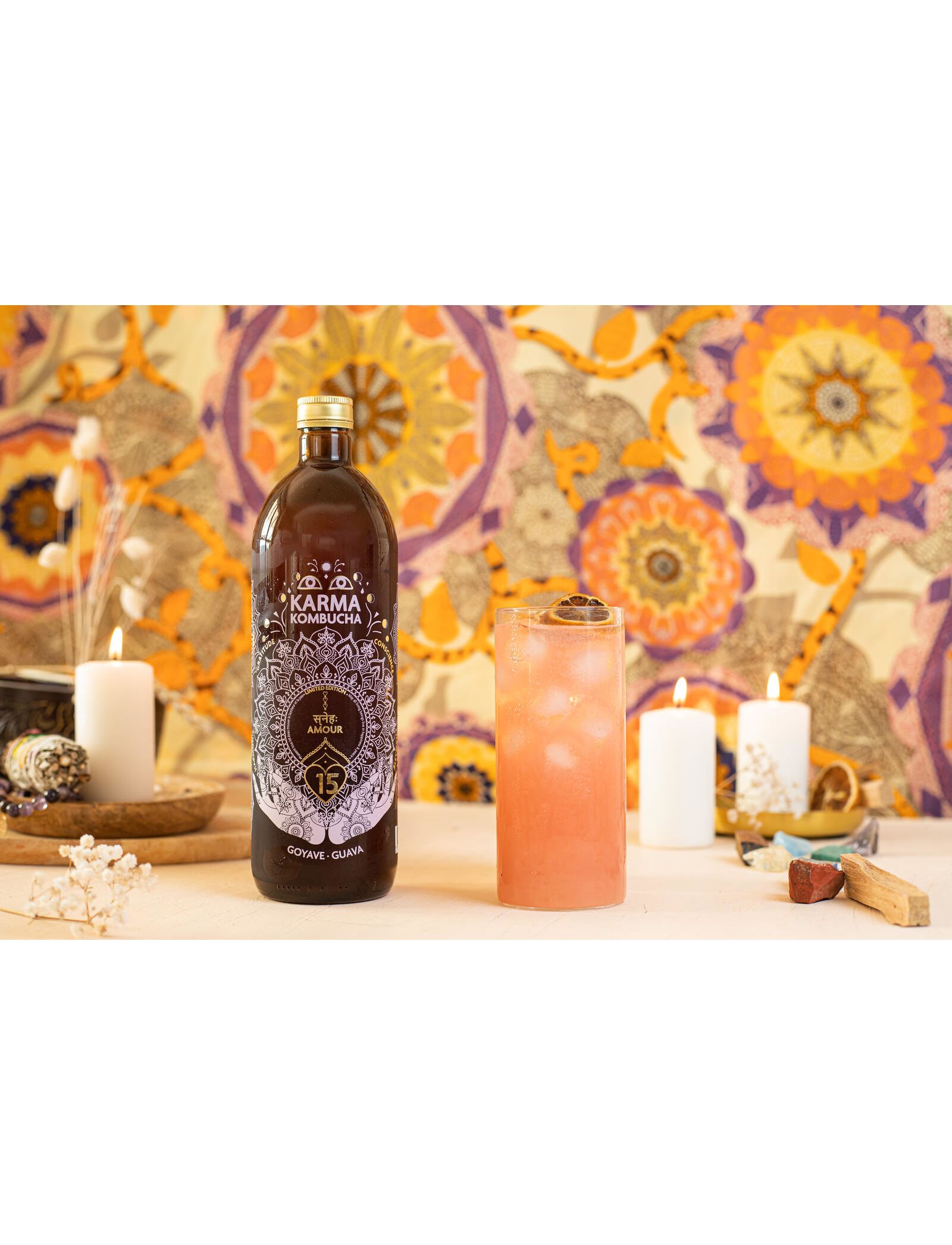 Склад: Карма Комбуча* (вода питна фільтрована, цукор світлий тростинний*, чай зелений*, культура комбучі*), пюре гуави 5%*, настій гібіскуса*, пюре малини*, екстракт троянди*, вуглекислий газ, що утворюється в результаті ферментації. Містить сліди алкоголю. *з органічного виробництва.