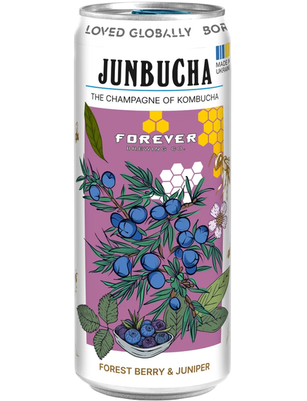 JUNBUCHA Лісові ягоди та ялівець – це натуральний ферментований напій, виготовлений із зеленого чаю та меду в стилі Джун, що поєднує свіжість лісових ягід з виразними нотками ялівцю. М’який з ніжною солодкістю, його часто називають «шампанським комбучі».