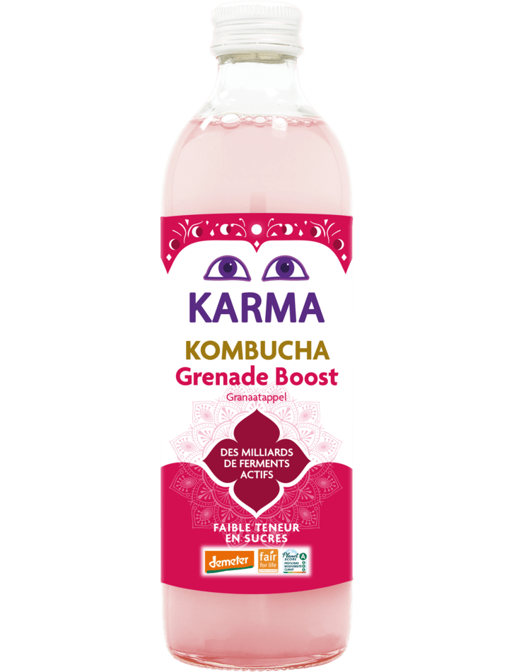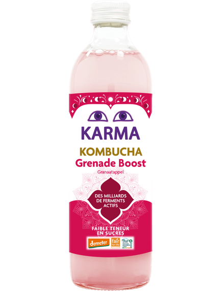 Склад: Karma Kombucha (фільтрована вода, світлий тростинний цукор, зелений чай, культура чайного гриба), настій гібіскуса, гранатовий сік 14%, малинове пюре, сік імбиру, добірна жива культура.