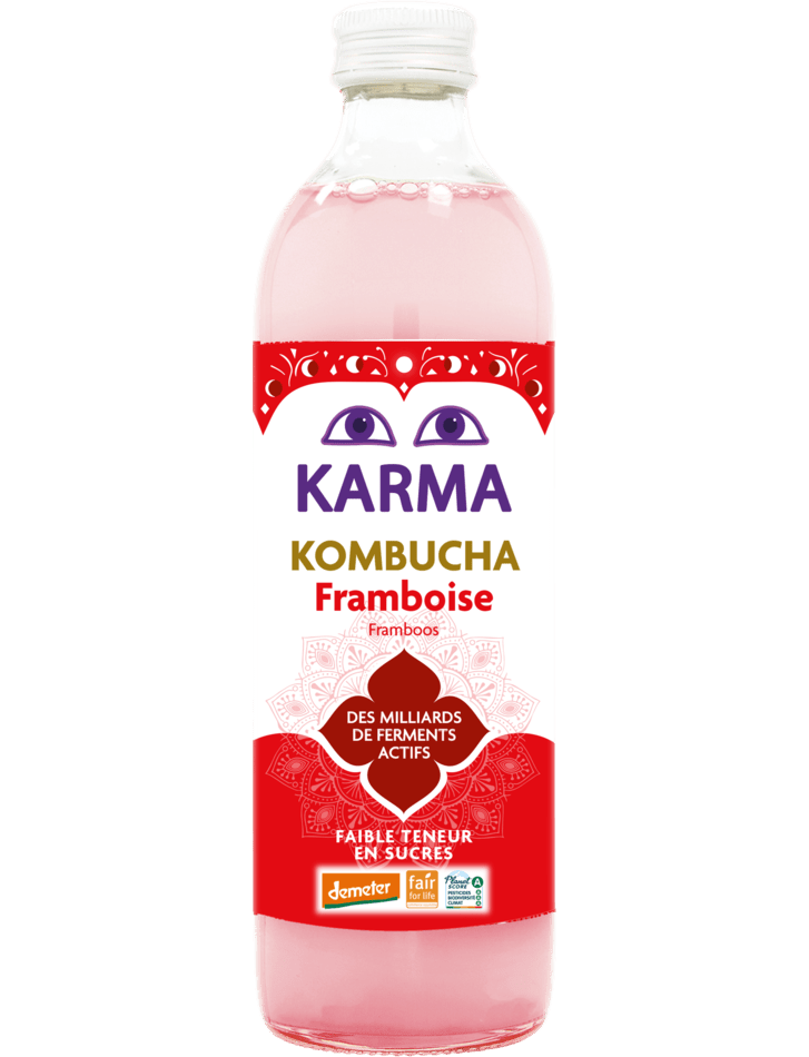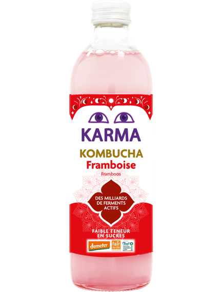 Склад: Karma Kombucha 97% (фільтрована вода, світлий тростинний цукор з Парагваю, зелений чай Індії, культура чайного гриба), настій гібіскуса, аромат малини.