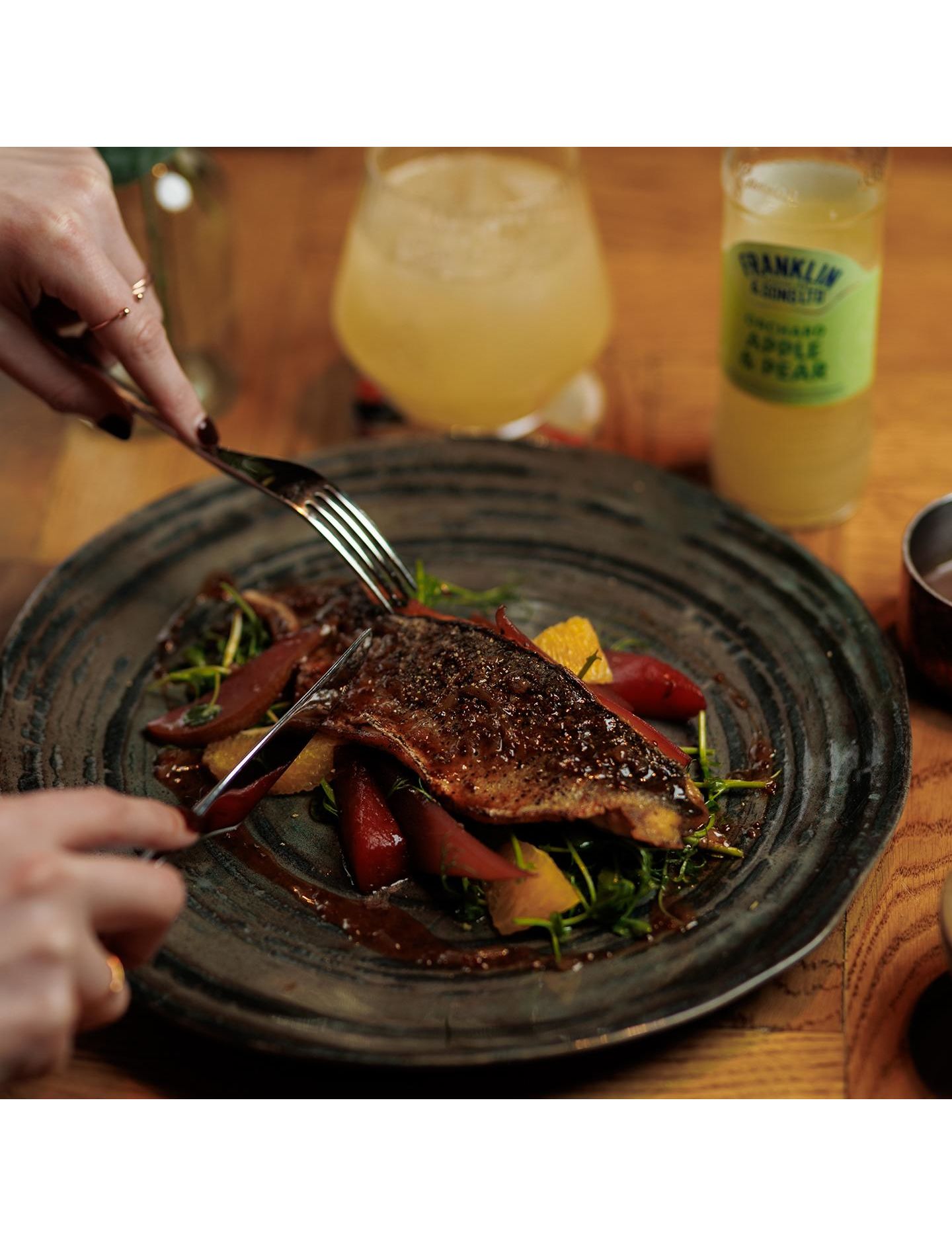 Натуральний шипучий та фруктовий свіжий смак яблука та груші Franklin & Sons Orchard Apple & Pear чудово доповнює страву, роблячи її чудовим поєднанням для любителів морепродуктів.