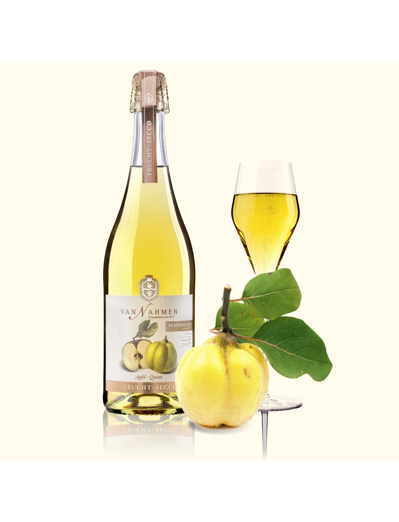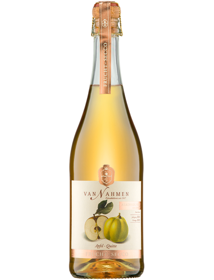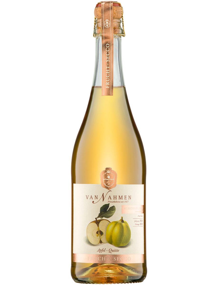 Якщо скласти сік з яблука та айви, то кюве розкриє чарівно насичений смак, що нагадує зрілий Рислінг. van Nahmen Fruit-Secco Apfel-Quitte (яблуко-айва) — сухий фруктовий аперитив з 0% алкоголю та 100% ігристого фруктового насолоди. Його багатошаровий аромат найкраще розкривається при температурі 8–10°C. Яблуко та айва просто створені одне для одного: терпка кислинка айви та соковита солодкість яблука чудово доповнюють одне одного в цьому ігристому Fruit-Secco.