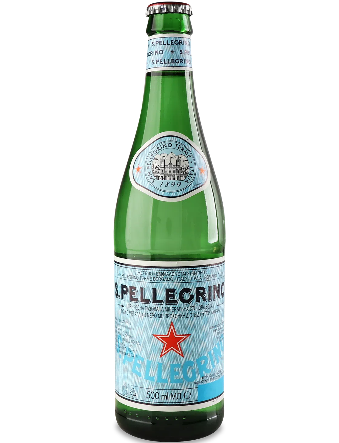 500 мл скляна пляшка газованої мінеральної води, ідеальна кількість для швидкого харчування.