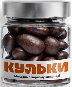 Склад: смажений мигдаль, чорний шоколад. Мигдаль в чорному шоколаді Поживна (харчова) цінність 100г продукту: білки – 13,5г, жири – 41,8г, вуглеводи – 32,2г. Енергетична цінність (калорійність) 100г продукту: 577 ккал I 2396 кДж Термін придатності: 6 місяців.