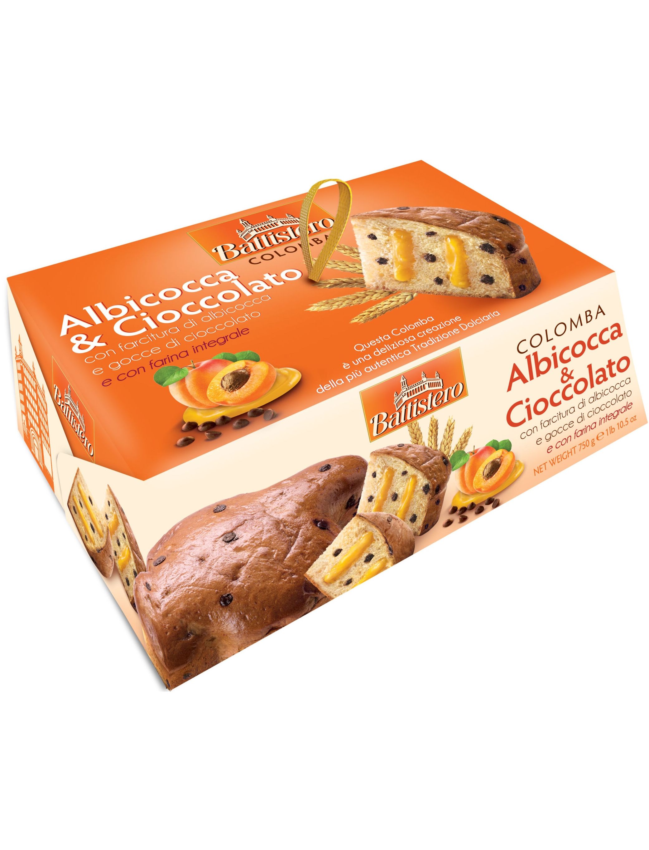 Великодня коломба з абрикосовим кремом та шоколадними дропсами від Battistero — це класичний італійський святковий кекс у формі голуба, що символізує мир і відродження. Виріб поєднує традиційну рецептуру повільного дріжджового тіста з ніжною фруктово-шоколадною начинкою.