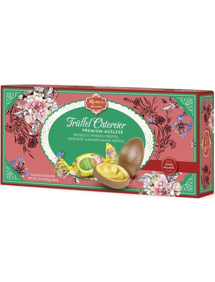 Побалуйте себе ексклюзивним асортиментом трюфельних великодніх яєць Reber – справжнім шедевром кондитерського мистецтва. Ці вишукані пасхальні яйця поєднують у собі смаки персикового просекко, яєчного лікеру та крему з віскі, які гармонійно розкриваються у найтоншому альпійському молочному шоколаді.
