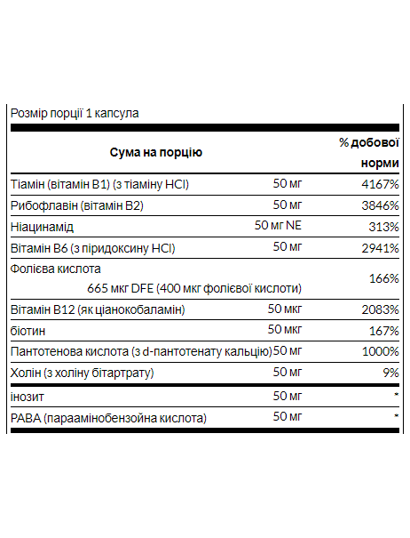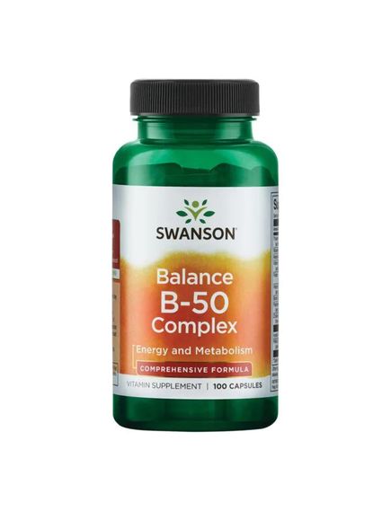 Сприяє зміцненню нервової системи, імунітету та серцево-судинної системи Підтримує вироблення нейротрансмітерів для гарного настрою Захищає від спричиненого стресом виснаження поживних речовин Вітаміни групи В відіграють важливу роль у всьому організмі, від серцево-судинної системи та психічного здоров'я до енергетичного обміну. Swanson Balance B-50 забезпечує високу ефективність комплексу вітамінів групи В для забезпечення оптимальної поживної ефективності. Рекомендації щодо застосування: як харчова добавка приймайте по одній капсулі на день, запиваючи водою.
