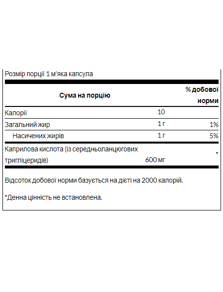 Swanson Caprylic Acid містить 600 мг каприлової кислоти C8 в одній зручній для ковтання м'якої капсули для підтримки енергії та метаболізму. Каприлова кислота є тригліцерид із середньою довжиною ланцюга (MCT), тип ліпіду, який перетравлюється не в кишечнику, а швидше в печінці, як і вуглеводи. Таким чином, він дає швидку енергію більш ніж удвічі більше, ніж глюкоза. Каприлова кислота була вперше популяризована як харчова добавка доктором Вільямом Круком, автором знаменитої книги з внутрішньої екології Зв'язок дріжджів». Сьогодні він широко використовується як доповнення до інших ефективних добавок, таких як ацидофілін та ФОС, для підтримки здорового мікробного балансу. Він також набирає популярності серед спортсменів, які цінують його за швидку енергію.