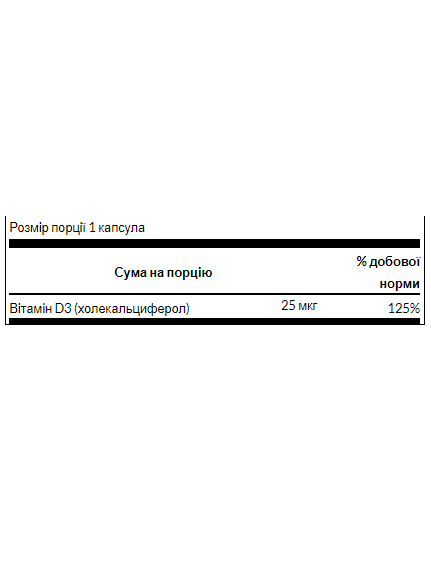 Підтримує здоров'я кісток, а також здоров'я імунної та серцево-судинної системи Сприяє засвоєнню кальцію в організмі Найбільш біологічно активна форма вітаміну D Вітамін D-3 Swanson – це важливий вітамін для підтримки кісток, який сприяє ефективному засвоєнню кальцію в організмі. Організм виробляє деяку кількість вітаміну D самостійно, коли піддається впливу сонячного світла, але для людей, які живуть у північних широтах, де перебування на сонці в зимовий час обмежене, природного вітаміну D в організмі часто може бути недостатньо. Наші капсули з вітаміном D-3 з високою активністю вирішують цю проблему, забезпечуючи вражаючу 1000 МО вітаміну D-3, найбільш біологічно активної фракції вітаміну D. Додаткові факти Розмір порції 1 капсула Кількість на порцію % Денна вартість Вітамін D3 (холекальциферол) 25 мкг %