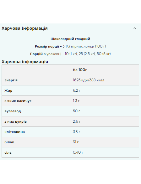 Ця суміш ідеально підходить для всіх, хто хоче збільшити щоденний прийом білка та кількість калорій у раціоні. Зверніть увагу, що інформація на етикетці цього продукту надана англійською мовою. Однак, залежно від продукту, інформація може бути також надана французькою, італійською, німецькою, іспанською, датською, шведською та фінською мовами. Ключові переваги 380 калорій у порції Поступова подача енергії Допомагає зростанню та підтримці м'язової маси Розмір порції - 3 ¹/³ мірних ложки (100 гр) Порцій в упаковці - 25 (2.5 кг) Харчова цінність *RI Калорійність 1506 кД/1 % Жир 6.2 гр 9% з яких насиченого 1.1 гр 6% Вуглеводи 44 гр 17% з яких цукру 1.6 гр 2% Протеїн 28 гр 56% Сіль 0.50 гр 8% * Рекомендована норма споживання для середнього дорослого (8200 кД наведено для версії продукту без смаку, в інших випадках вони можуть відрізнятися до 10%
