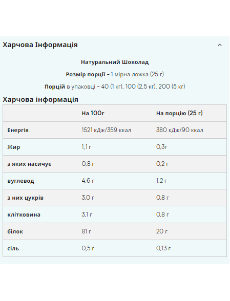 Штрихкод: 5055534325865Що таке Impact Whey Isolate? Impact Whey Isolate містить до 90% білка, володіючи низьким щодо більшості інших сироваткових білків вмістом жирів (0.3г) та вуглеводів (2.5г) у кожній порції. Комплексний профіль амінокислот даного продукту забезпечить усіма незамінними амінокислотами (EEA) і більш ніж 2г лейцину в кожній порції. Переваги Impact Whey Isolate Impact Whey Isolate ідеально підходить для всіх, хто хоче збільшити щоденне споживання білка або потребує прийому білка перед тренуванням або після нього. Завдяки високому вмісту білка (до 23г на порцію), даний продукт сприятиме зростанню та підтримці сухої м'язової маси. Impact Whey Isolate доступний більш ніж у 20 різних смаках, включаючи лінійку натуральних смаків. Кому підходить Impact Whey Isolate? Impact Whey Isolate ідеально підходить для всіх, хто бажає збільшити щоденне споживання білка. Ми рекомендуємо приймати Impact Whey Isolate до або після тренування, а також у будь-який час для збільшення споживання білка. Ключові переваги До 90% білка Низький вміст вуглеводів та жирів Ідеально підходить для набору та підтримки сухої м'язової маси Розмір порції - 1 мірна ложка (25г) Порцій в упаковці - 40 (1кг), 100 (2.5кг), 160 (4кг) Поживна Цінність У 100г У порції (25г) 0.3 г 0.1 г з яких насичених 0.3 г 0.1 г Вуглеводів 2.5 г 0.6 г з яких цукру 2.5 г 0.6 г Білка 90 г 23 г Солі 0.50 г 0.13 г