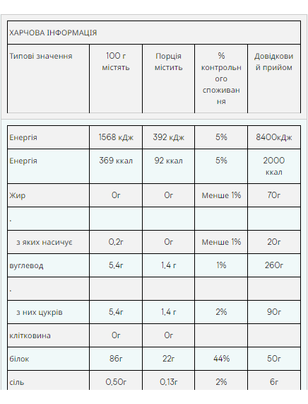 Штрихкод: 5055534303139Що таке Impact Whey Isolate? Impact Whey Isolate містить до 90% білка, володіючи низьким щодо більшості інших сироваткових білків вмістом жирів (0.3г) та вуглеводів (2.5г) у кожній порції. Комплексний профіль амінокислот даного продукту забезпечить усіма незамінними амінокислотами (EEA) і більш ніж 2г лейцину в кожній порції. Переваги Impact Whey Isolate Impact Whey Isolate ідеально підходить для всіх, хто хоче збільшити щоденне споживання білка або потребує прийому білка перед тренуванням або після нього. Завдяки високому вмісту білка (до 23г на порцію), даний продукт сприятиме зростанню та підтримці сухої м'язової маси. Impact Whey Isolate доступний більш ніж у 20 різних смаках, включаючи лінійку натуральних смаків. Кому підходить Impact Whey Isolate? Impact Whey Isolate ідеально підходить для всіх, хто бажає збільшити щоденне споживання білка. Ми рекомендуємо приймати Impact Whey Isolate до або після тренування, а також у будь-який час для збільшення споживання білка. Ключові переваги До 90% білка Низький вміст вуглеводів та жирів Ідеально підходить для набору та підтримки сухої м'язової маси Розмір порції - 1 мірна ложка (25г) Порцій в упаковці - 40 (1кг), 100 (2.5кг), 160 (4кг) Поживна Цінність У 100г У порції (25г) 0.3 г 0.1 г з яких насичених 0.3 г 0.1 г Вуглеводів 2.5 г 0.6 г з яких цукру 2.5 г 0.6 г Білка 90 г 23 г Солі 0.50 г 0.13 г