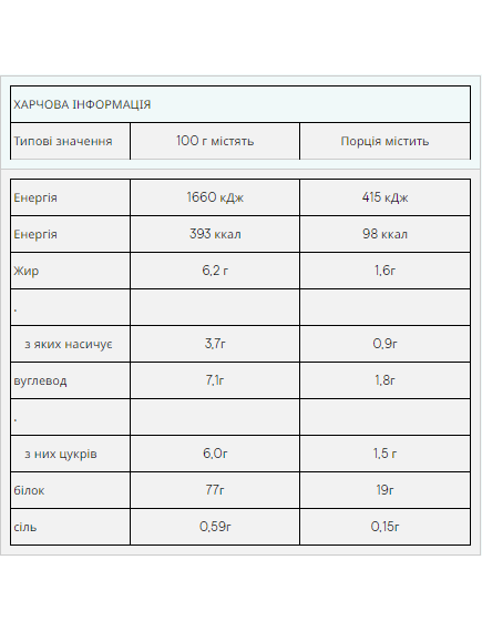 Штрихкод: 5056307356451Що таке Impact Whey Protein? Наш бестселер Impact Whey Protein® виготовляється з високоякісного концентрату сироваткового білка та містить більше 20г білка в кожній порції (80%). Комплексний профіль амінокислот даного продукту з вмістом більше 2гр лейцину в порції забезпечить вас усіма незамінними амінокислотами (EEA). Якщо ви шукаєте протеїн найвищої якості, з винятковим співвідношенням якості та ціни та чудовим смаком – то це те, що вам потрібно. Ми пишаємося тим, що можемо запропонувати вам протеїнові коктейлі із широким асортиментом смаків. Ви можете вибрати класичні смаки, такі як шоколад або ваніль, а також нові смаки, такі як Тірамісу, Ревень із Заварним Кремом та Лимонний Чізкейк. Переваги Impact Whey Protein Цей продукт є ідеальним вибором для всіх спортсменів та звичайних відвідувачів тренажерних залів, який допоможе досягти спортивних цілей. Споживання великої кількості білка сприятиме зростанню та підтримці м'язової маси. Impact Whey Protein доступний у понад 40 смаках, таких як Печиво зі Вершками, Ревень із Заварним Кремом, Літні Фрукти, а також у багатьох інших натуральних смаках. Кому підходить Impact Whey Protein? Продукт ідеально підходить для всіх, хто хоче збільшити щоденне споживання білка. Рекомендується приймати Impact Whey Protein як до, так і після тренувань, а також будь-коли протягом дня, якщо ви хочете збільшити прийом білка. Як приймати Impact Whey Protein? Impact Whey Protein швидко всмоктується, тому краще приймати його після тренувань. Його можна вживати з водою чи молоком, як смачний протеїновий коктейль, або поєднуючи з улюбленим соком чи йогуртом. Ключові переваги Кожна порція містить більше 80% білка Прекрасно підходить для росту та підтримки м'язів Розмір порції - 1 мірна ложка (25 гр) Порцій в упаковці - 40 (1 кг), 100 (2.5 кг), 200 (5 кг) Харчова цінність У 100 гр У порції *RI Калорійність 1740 кДж/412 ккал 435 кДж ккал 5% Жир 7.5 гр 1.9 гр 3% з яких насиченого 5.0 гр 1.3 гр 6% Вуглеводи 4.0 гр 1.0 гр 0.5% з яких цукру 4.0 гр 1.0 гр 1% Протеїн 82 гр 21 гр 4 Рекомендована норма споживання середнього дорослого (8400 кДж/2000 ккал) Інформація дана для версії без смаку, в інших варіантах значення можуть відрізнятися до 15%