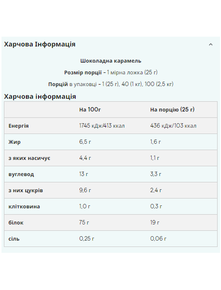 Штрихкод: 5055534317051Що таке Impact Whey Protein? Наш бестселер Impact Whey Protein® виготовляється з високоякісного концентрату сироваткового білка та містить більше 20г білка в кожній порції (80%). Комплексний профіль амінокислот даного продукту з вмістом більше 2гр лейцину в порції забезпечить вас усіма незамінними амінокислотами (EEA). Якщо ви шукаєте протеїн найвищої якості, з винятковим співвідношенням якості та ціни та чудовим смаком – то це те, що вам потрібно. Ми пишаємося тим, що можемо запропонувати вам протеїнові коктейлі із широким асортиментом смаків. Ви можете вибрати класичні смаки, такі як шоколад або ваніль, а також нові смаки, такі як Тірамісу, Ревень із Заварним Кремом та Лимонний Чізкейк. Переваги Impact Whey Protein Цей продукт є ідеальним вибором для всіх спортсменів та звичайних відвідувачів тренажерних залів, який допоможе досягти спортивних цілей. Споживання великої кількості білка сприятиме зростанню та підтримці м'язової маси. Impact Whey Protein доступний у понад 40 смаках, таких як Печиво зі Вершками, Ревень із Заварним Кремом, Літні Фрукти, а також у багатьох інших натуральних смаках. Кому підходить Impact Whey Protein? Продукт ідеально підходить для всіх, хто хоче збільшити щоденне споживання білка. Рекомендується приймати Impact Whey Protein як до, так і після тренувань, а також будь-коли протягом дня, якщо ви хочете збільшити прийом білка. Як приймати Impact Whey Protein? Impact Whey Protein швидко всмоктується, тому краще приймати його після тренувань. Його можна вживати з водою чи молоком, як смачний протеїновий коктейль, або поєднуючи з улюбленим соком чи йогуртом. Ключові переваги Кожна порція містить більше 80% білка Прекрасно підходить для росту та підтримки м'язів Розмір порції - 1 мірна ложка (25 гр) Порцій в упаковці - 40 (1 кг), 100 (2.5 кг), 200 (5 кг) Харчова цінність У 100 гр У порції *RI Калорійність 1740 кДж/412 ккал 435 кДж ккал 5% Жир 7.5 гр 1.9 гр 3% з яких насиченого 5.0 гр 1.3 гр 6% Вуглеводи 4.0 гр 1.0 гр 0.5% з яких цукру 4.0 гр 1.0 гр 1% Протеїн 82 гр 21 гр 4 Рекомендована норма споживання середнього дорослого (8400 кДж/2000 ккал) Інформація дана для версії без смаку, в інших варіантах значення можуть відрізнятися до 15%