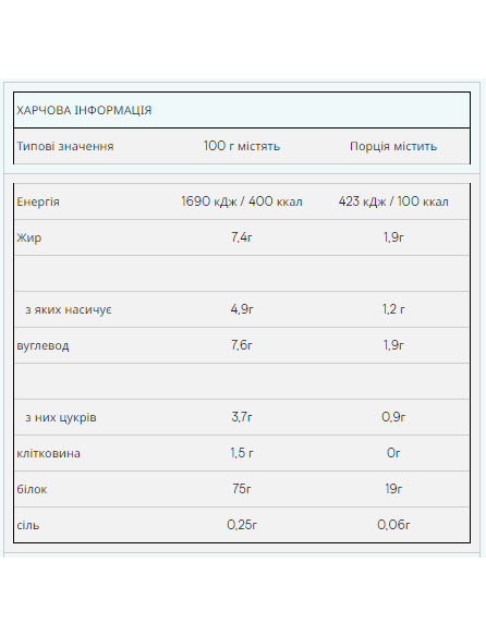 Штрихкод: 5055534302682Що таке Impact Whey Protein? Наш бестселер Impact Whey Protein® виготовляється з високоякісного концентрату сироваткового білка та містить більше 20г білка в кожній порції (80%). Комплексний профіль амінокислот даного продукту з вмістом більше 2гр лейцину в порції забезпечить вас усіма незамінними амінокислотами (EEA). Якщо ви шукаєте протеїн найвищої якості, з винятковим співвідношенням якості та ціни та чудовим смаком – то це те, що вам потрібно. Ми пишаємося тим, що можемо запропонувати вам протеїнові коктейлі із широким асортиментом смаків. Ви можете вибрати класичні смаки, такі як шоколад або ваніль, а також нові смаки, такі як Тірамісу, Ревень із Заварним Кремом та Лимонний Чізкейк. Переваги Impact Whey Protein Цей продукт є ідеальним вибором для всіх спортсменів та звичайних відвідувачів тренажерних залів, який допоможе досягти спортивних цілей. Споживання великої кількості білка сприятиме зростанню та підтримці м'язової маси. Impact Whey Protein доступний у понад 40 смаках, таких як Печиво зі Вершками, Ревень із Заварним Кремом, Літні Фрукти, а також у багатьох інших натуральних смаках. Кому підходить Impact Whey Protein? Продукт ідеально підходить для всіх, хто хоче збільшити щоденне споживання білка. Рекомендується приймати Impact Whey Protein як до, так і після тренувань, а також будь-коли протягом дня, якщо ви хочете збільшити прийом білка. Як приймати Impact Whey Protein? Impact Whey Protein швидко всмоктується, тому краще приймати його після тренувань. Його можна вживати з водою чи молоком, як смачний протеїновий коктейль, або поєднуючи з улюбленим соком чи йогуртом. Ключові переваги Кожна порція містить більше 80% білка Прекрасно підходить для росту та підтримки м'язів Розмір порції - 1 мірна ложка (25 гр) Порцій в упаковці - 40 (1 кг), 100 (2.5 кг), 200 (5 кг) Харчова цінність У 100 гр У порції *RI Калорійність 1740 кДж/412 ккал 435 кДж ккал 5% Жир 7.5 гр 1.9 гр 3% з яких насиченого 5.0 гр 1.3 гр 6% Вуглеводи 4.0 гр 1.0 гр 0.5% з яких цукру 4.0 гр 1.0 гр 1% Протеїн 82 гр 21 гр 4 Рекомендована норма споживання середнього дорослого (8400 кДж/2000 ккал) Інформація дана для версії без смаку, в інших варіантах значення можуть відрізнятися до 15%