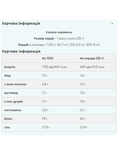 Штрихкод: 5055534339992Що таке Impact Whey Protein? Наш бестселер Impact Whey Protein® виготовляється з високоякісного концентрату сироваткового білка та містить більше 20г білка в кожній порції (80%). Комплексний профіль амінокислот даного продукту з вмістом більше 2гр лейцину в порції забезпечить вас усіма незамінними амінокислотами (EEA). Якщо ви шукаєте протеїн найвищої якості, з винятковим співвідношенням якості та ціни та чудовим смаком – то це те, що вам потрібно. Ми пишаємося тим, що можемо запропонувати вам протеїнові коктейлі із широким асортиментом смаків. Ви можете вибрати класичні смаки, такі як шоколад або ваніль, а також нові смаки, такі як Тірамісу, Ревень із Заварним Кремом та Лимонний Чізкейк. Переваги Impact Whey Protein Цей продукт є ідеальним вибором для всіх спортсменів та звичайних відвідувачів тренажерних залів, який допоможе досягти спортивних цілей. Споживання великої кількості білка сприятиме зростанню та підтримці м'язової маси. Impact Whey Protein доступний у понад 40 смаках, таких як Печиво зі Вершками, Ревень із Заварним Кремом, Літні Фрукти, а також у багатьох інших натуральних смаках. Кому підходить Impact Whey Protein? Продукт ідеально підходить для всіх, хто хоче збільшити щоденне споживання білка. Рекомендується приймати Impact Whey Protein як до, так і після тренувань, а також будь-коли протягом дня, якщо ви хочете збільшити прийом білка. Як приймати Impact Whey Protein? Impact Whey Protein швидко всмоктується, тому краще приймати його після тренувань. Його можна вживати з водою чи молоком, як смачний протеїновий коктейль, або поєднуючи з улюбленим соком чи йогуртом. Ключові переваги Кожна порція містить більше 80% білка Прекрасно підходить для росту та підтримки м'язів Розмір порції - 1 мірна ложка (25 гр) Порцій в упаковці - 40 (1 кг), 100 (2.5 кг), 200 (5 кг) Харчова цінність У 100 гр У порції *RI Калорійність 1740 кДж/412 ккал 435 кДж ккал 5% Жир 7.5 гр 1.9 гр 3% з яких насиченого 5.0 гр 1.3 гр 6% Вуглеводи 4.0 гр 1.0 гр 0.5% з яких цукру 4.0 гр 1.0 гр 1% Протеїн 82 гр 21 гр 4 Рекомендована норма споживання середнього дорослого (8400 кДж/2000 ккал) Інформація дана для версії без смаку, в інших варіантах значення можуть відрізнятися до 15%