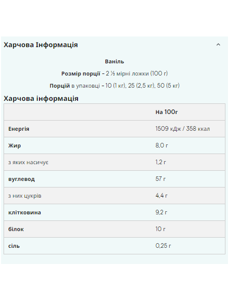 Штрихкод: 5055534302491Що така розчинна вівсянка? Розчинна вівсянка є відмінним джерелом вуглеводів з низьким глікемічним індексом (ГІ), що ідеально підходять для підживлення ваших вправ. Ми отримуємо нашу вівсянку з кращого вовса шотландського, перемелюючи його в ультра тонкий порошок. Тим самим, ми надаємо вам вуглеводи з низьким ГІ, які ви можете змішати з будь-якою рідиною і вживати без труднощів. Розчинна вівсянка є виключно корисним джерелом вуглеводів, так як вона забезпечує організм тривалим запасом енергії. Це робить вівсянку ідеальним вибором для тих, хто хоче збільшити прийом вуглеводів протягом дня. Будучи джерелом вуглеводів, що повільно засвоюються, розчинна вівсянка надає менший вплив на рівень цукру в крові в порівнянні з декстрозою і мальтодекстрином. Ультра тонкий помел дозволяє зберегти всі поживні речовини та корисні властивості вівсянки, при цьому створюючи вкрай зручну для зберігання форму продукту, не кажучи вже про чудовий смак! Універсальність розчинної вівсянки дозволяє вам додавати її в готові коктейлі, приймати її окремо або навіть додавати в певні продукти, такі як йогурт, smoothie і випічку. Кому підходить? Ідеальний вибір для тих, хто шукає підвищення їх споживання вуглеводів протягом дня. Універсальність вівсянки дозволяє додавати їх до будь-якого протеїнового коктейлю, споживати їх самостійно або навіть додати їх на певні продукти, як йогурт, фруктові коктейлі та хлібобулочні вироби. Ключові переваги Відмінне джерело вуглеводів із низьким глікемічним індексом (ГІ) Ідеальне джерело тривалої енергії Відмінний смак та змішуваність. Харчова цінність У порції *RI Калорійність 1616 кДж/384 ккал 18% Жир 7.7 гр 12% з яких насиченого 1.4 гр 7% Вуглеводи 62 гр 19% з яких цукру 1.1 гр 1% Клітковина 11 гр 0 0 4%