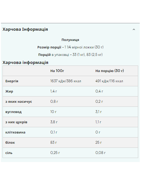 Штрихкод: 5055534319697Що таке міцелярний казеїн? Міцелярний казеїн – повільний білок найвищої якості, отриманий із молока. За допомогою процесу ультрафільтрації при низькій температурі кінцевий інгредієнт зберігає свої поживні якості та функціональність, якщо порівнювати його з кислотним казеїном або казеїнатами. Переваги міцелярного казеїну? Міцелярний казеїн повільно засвоюється у шлунку, що дозволяє м'язам плавно та поступово отримувати амінокислоти протягом тривалого часу. Ці властивості роблять міцелярний казеїн ідеальною білковою добавкою для використання між їдою і перед сном. Під час сну організм отримує мало поживних речовин, оскільки вживати їжу непрактично. Однак унаслідок того, що міцелярний казеїн надає постійне забезпечення білком, це дозволяє організму запобігти руйнуванню м'язової тканини під час сну. Міцелярний казеїн має відмінний профіль амінокислот, з досить високим вмістом амінокислот з розгалуженими ланцюжками (BCAA). У ньому також дуже мало жиру, але при цьому він є хорошим джерелом отримання кальцію. Кому підходить? Міцелярний казеїн ідеально підходить для тих, хто займається довгостроковою фізичною підготовкою, де отримання правильного дієтичного балансу є необхідним. Ключові переваги Білок повільного розщеплення Багатий амінокислотами Високий вміст білка при низькому вмісті жирів та вуглеводів На 100г: Енергетична цінність (кДж/ккал): 1518/358 Жиров: 1.5г з них насичених: 0.8г Вуглеводів. г Білка: 80г Сіль: 0.4г У кожній порції (30г) міститься: Енергетична цінність (кДж/ккал): 455/107 Жиров: 0.5г з них насичених: 0.2г Вуглеводів: 1.8г з яких цукор: 1.2г Білка: 24г Сіль: 0.1г