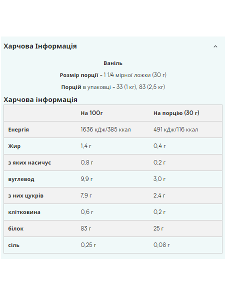 Штрихкод: 5055534319703Що таке міцелярний казеїн? Міцелярний казеїн – повільний білок найвищої якості, отриманий із молока. За допомогою процесу ультрафільтрації при низькій температурі кінцевий інгредієнт зберігає свої поживні якості та функціональність, якщо порівнювати його з кислотним казеїном або казеїнатами. Переваги міцелярного казеїну? Міцелярний казеїн повільно засвоюється у шлунку, що дозволяє м'язам плавно та поступово отримувати амінокислоти протягом тривалого часу. Ці властивості роблять міцелярний казеїн ідеальною білковою добавкою для використання між їдою і перед сном. Під час сну організм отримує мало поживних речовин, оскільки вживати їжу непрактично. Однак унаслідок того, що міцелярний казеїн надає постійне забезпечення білком, це дозволяє організму запобігти руйнуванню м'язової тканини під час сну. Міцелярний казеїн має відмінний профіль амінокислот, з досить високим вмістом амінокислот з розгалуженими ланцюжками (BCAA). У ньому також дуже мало жиру, але при цьому він є хорошим джерелом отримання кальцію. Кому підходить? Міцелярний казеїн ідеально підходить для тих, хто займається довгостроковою фізичною підготовкою, де отримання правильного дієтичного балансу є необхідним. Ключові переваги Білок повільного розщеплення Багатий амінокислотами Високий вміст білка при низькому вмісті жирів та вуглеводів На 100г: Енергетична цінність (кДж/ккал): 1518/358 Жиров: 1.5г з них насичених: 0.8г Вуглеводів. г Білка: 80г Сіль: 0.4г У кожній порції (30г) міститься: Енергетична цінність (кДж/ккал): 455/107 Жиров: 0.5г з них насичених: 0.2г Вуглеводів: 1.8г з яких цукор: 1.2г Білка: 24г Сіль: 0.1г
