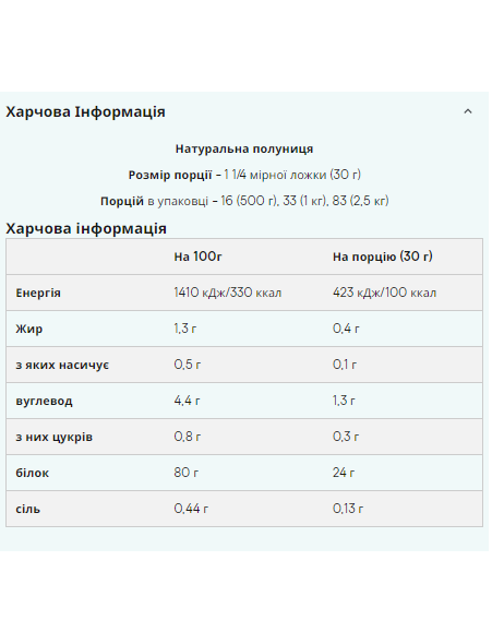Енергетична цінність: 113.7ккал Білок (початковий продукт): 27.8г Білок (готовий продукт): 26.4г Жиров: 0.9г Вуглеводів: 0.3г з яких цукру: сліди Просимо помітити, що інформація про поживні речовини взята з варіанта без смаку. При виборі варіанта зі смаком вміст білка зменшиться в середньому на 3%, однак, у шоколадних варіантах, у зв'язку з додаванням какао, вміст білка може зменшиться приблизно на 8%.