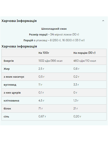 Штрихкод: 5056307360182Що таке Impact Whey Protein? Наш бестселер Impact Whey Protein® виготовляється з високоякісного концентрату сироваткового білка та містить більше 20г білка в кожній порції (80%). Комплексний профіль амінокислот даного продукту з вмістом більше 2гр лейцину в порції забезпечить вас усіма незамінними амінокислотами (EEA). Якщо ви шукаєте протеїн найвищої якості, з винятковим співвідношенням якості та ціни та чудовим смаком – то це те, що вам потрібно. Ми пишаємося тим, що можемо запропонувати вам протеїнові коктейлі із широким асортиментом смаків. Ви можете вибрати класичні смаки, такі як шоколад або ваніль, а також нові смаки, такі як Тірамісу, Ревень із Заварним Кремом та Лимонний Чізкейк. Переваги Impact Whey Protein Цей продукт є ідеальним вибором для всіх спортсменів та звичайних відвідувачів тренажерних залів, який допоможе досягти спортивних цілей. Споживання великої кількості білка сприятиме зростанню та підтримці м'язової маси. Impact Whey Protein доступний у понад 40 смаках, таких як Печиво зі Вершками, Ревень із Заварним Кремом, Літні Фрукти, а також у багатьох інших натуральних смаках. Кому підходить Impact Whey Protein? Продукт ідеально підходить для всіх, хто хоче збільшити щоденне споживання білка. Рекомендується приймати Impact Whey Protein як до, так і після тренувань, а також будь-коли протягом дня, якщо ви хочете збільшити прийом білка. Як приймати Impact Whey Protein? Impact Whey Protein швидко всмоктується, тому краще приймати його після тренувань. Його можна вживати з водою чи молоком, як смачний протеїновий коктейль, або поєднуючи з улюбленим соком чи йогуртом. Ключові переваги Кожна порція містить більше 80% білка Прекрасно підходить для росту та підтримки м'язів