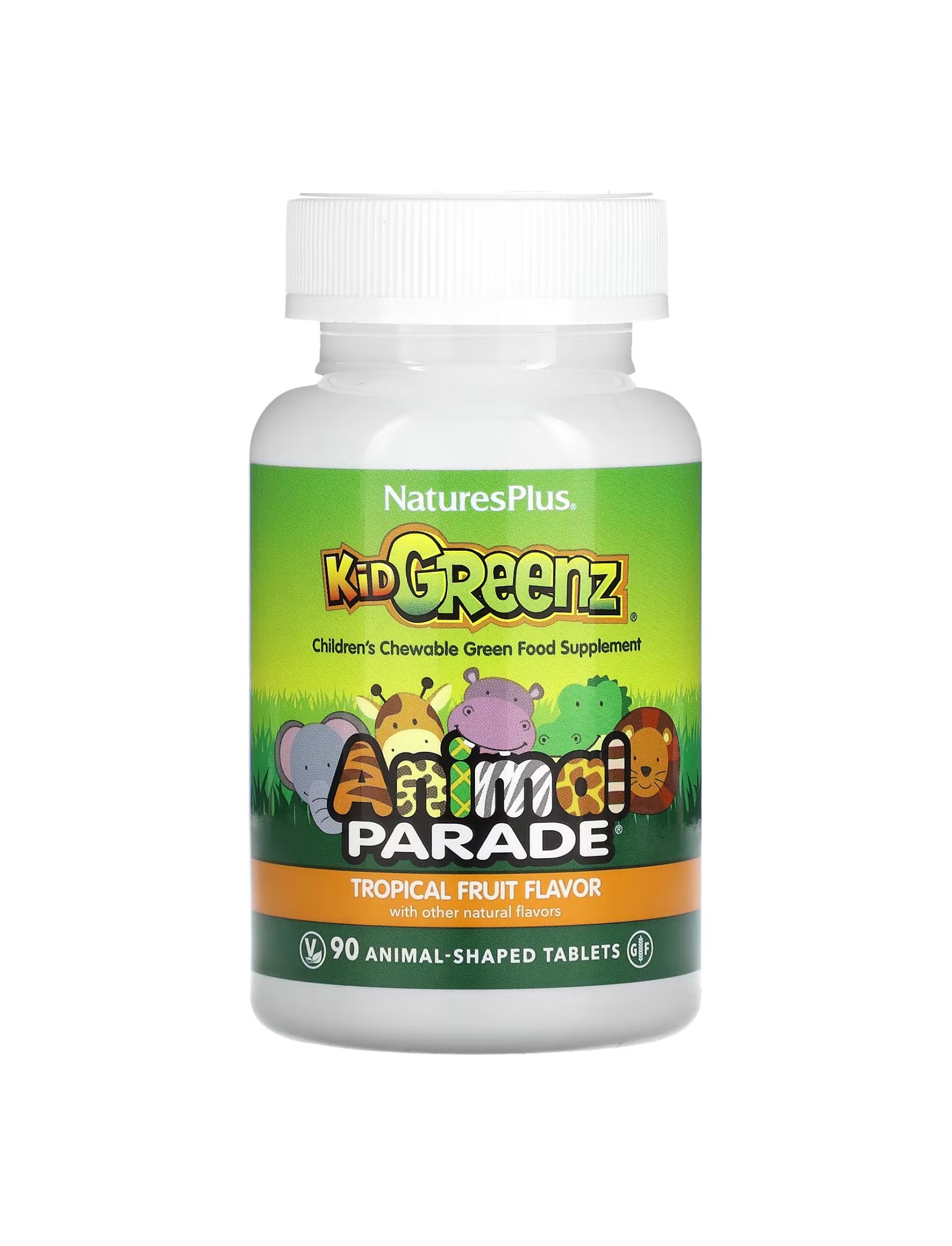 Animal Parade KidGreenz містить збалансовану запатентовану суміш зелених овочів і суперфудів океанічного походження. Смачні жувальні таблетки KidGreenz заряджають дитину енергією та забезпечують користь для здоров’я завдяки багатим на фітонутрієнти зеленим суперфудам із суші та моря. У комплексі суперфудів KidGreenz представлені броколі, шпинат, спіруліна, хлорела, бурі водорості та інші харчові джерела енергії, які зазвичай відсутні в раціоні дітей. Каталізатори росту лактобактерій від KidGreenz допомагають підтримувати здорове середовище кишківника, яке є критично важливим для загального стану здоров’я та самопочуття дітей.