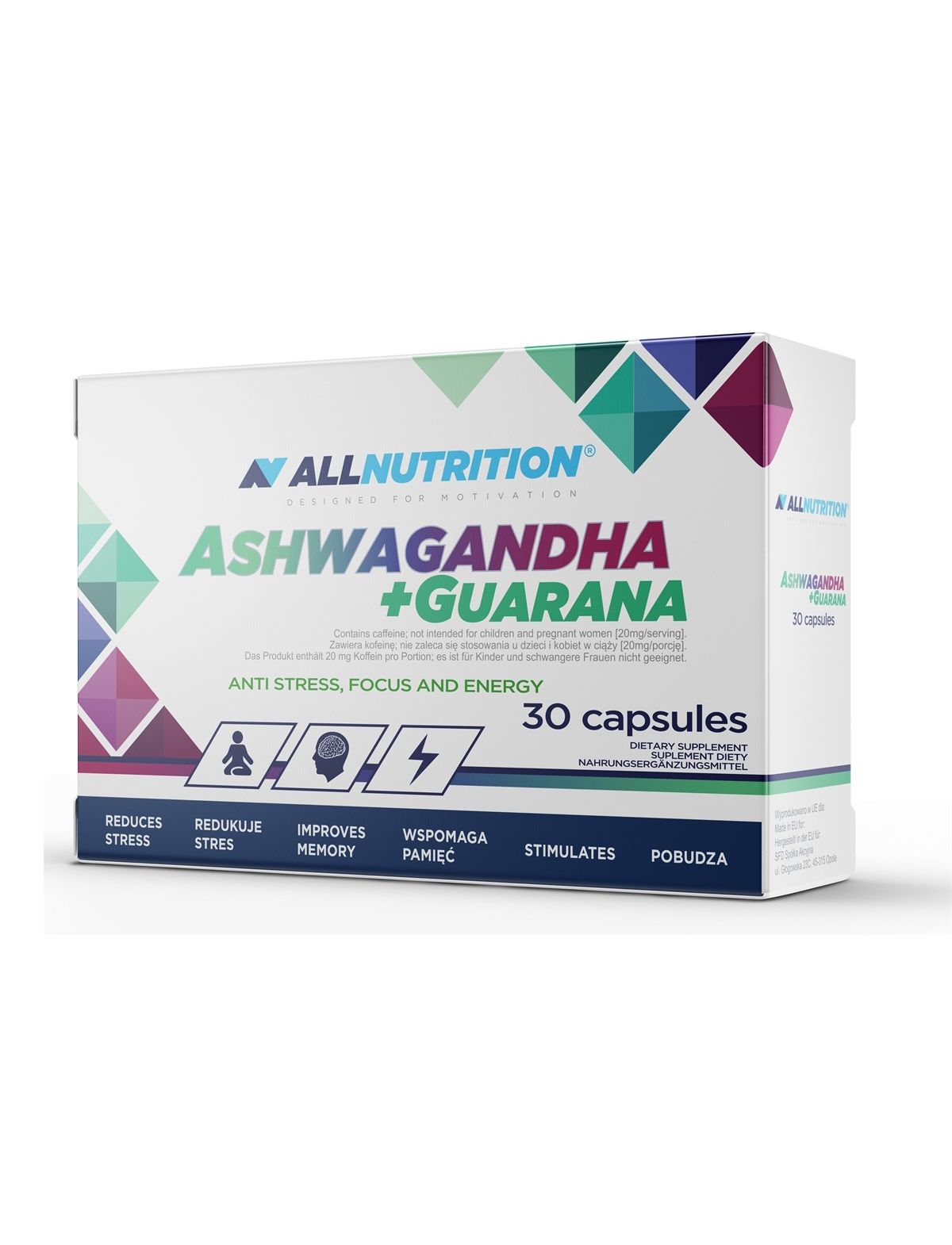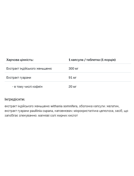 АШВАГАНДА + ГУАРАНАце продукт, що містить екстракт гуарани, стандартизований для 10% кофеїну та екстракт кореня індійського женьшеню (так званий ашваганда). АШВАГАНДА використовувалася в аюрведичній медицині протягом століть. Його властивості та значення для індійської медицини порівнюють із женьшенем у китайській медицині, звідси і назва індійський женьшень. ПІДВИЩУЄ СТРЕСОстійкість Покращує настрій і самопочуття ЗНИЖУЄ РІВЕНЬ КОРТИЗОЛУ ПІДТРИМУЄ ПАМ'ЯТЬ І КОНЦЕНТРАЦІЮ ДУЖЕ СИЛЬНИЙ АДАПТОГЕН