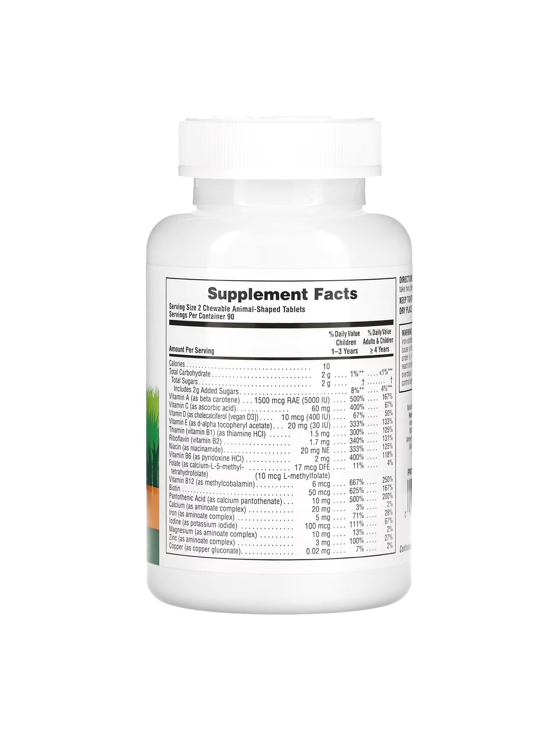 Натуральні підсолоджувачі (цукор без ГМО, фруктоза), натуральні ароматизатори, мікрокристалічна целюлоза, рослинна целюлоза, лимонна кислота (для ароматизатора), натуральний барвник (анато, винограду, буряковий сік, куркумін), карбонат кальцію, стеарат магнію, гуарова камедь, фумарат заліза, оксид магнію, спіруліна (природно багата необхідними поживними речовинами), оксид цинку, плоди шипшини (Rosa canina), цитрат калію, рисові висівки, плоди папаї, бурі водорості, морква, плоди мальпігії (Malpighia glabra), броколі, шпинат, плоди манго, аміноат калію, бітартрат холіну та стеаринова кислота. Мінеральні аміноати — хелати з цільного коричневого рису.