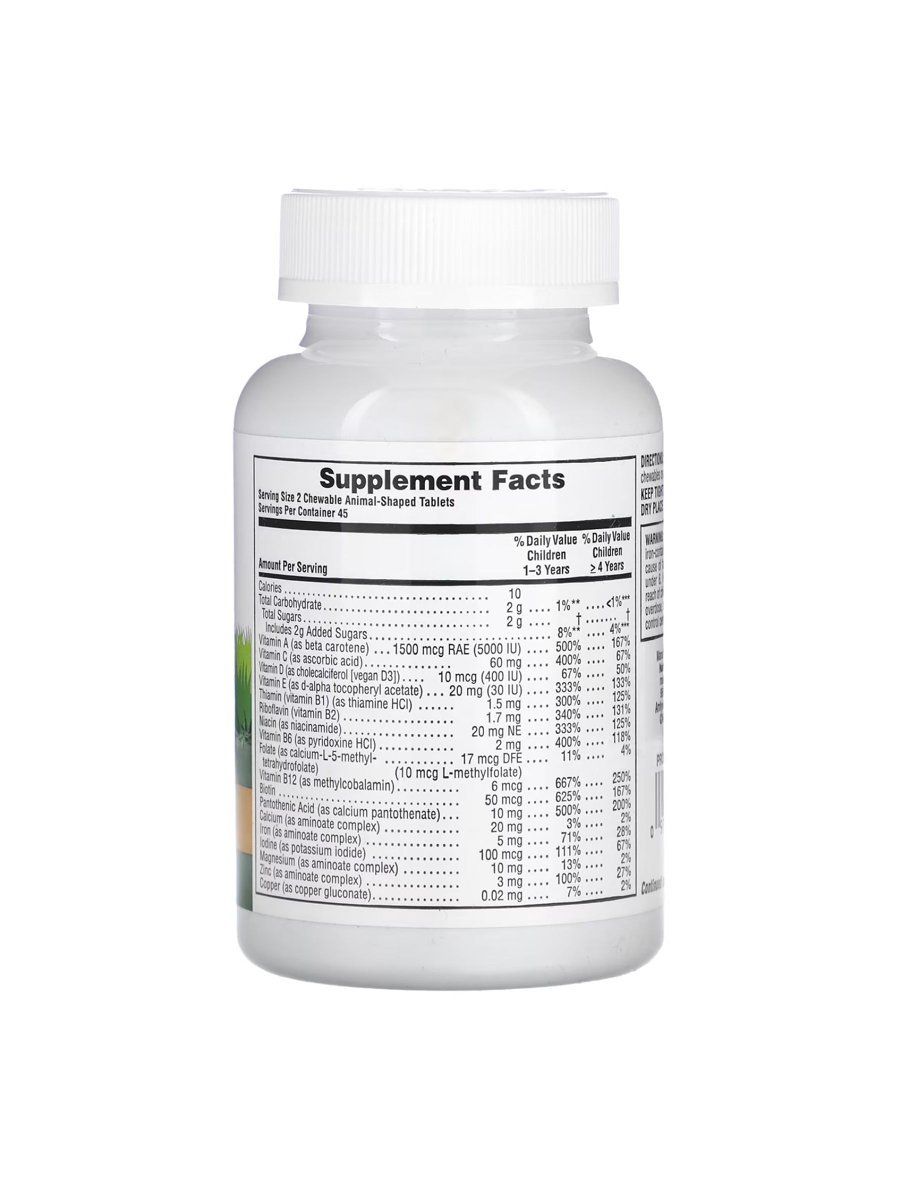 Натуральні підсолоджувачі (цукор без ГМО, фруктоза), натуральні ароматизатори, мікрокристалічна целюлоза, рослинна целюлоза, лимонна кислота (для ароматизатора), натуральний барвник (анато, винограду, буряковий сік, куркумін), карбонат кальцію, стеарат магнію, гуарова камедь, фумарат заліза, оксид магнію, спіруліна (природно багата необхідними поживними речовинами), оксид цинку, плоди шипшини (Rosa canina), цитрат калію, рисові висівки, плоди папаї, бурі водорості, морква, плоди мальпігії (Malpighia glabra), броколі, шпинат, плоди манго, аміноат калію, бітартрат холіну та стеаринова кислота. Мінеральні аміноати — хелати з цільного коричневого рису.