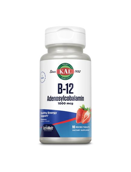 Інформація про продукт. Мікротаблетки KAL аденозилкобаламін ActivMelt із вітаміном B12 зі смаком натуральної полуниці швидко тануть у роті та призначені для поліпшеного засвоєння організмом. Аденозилкобаламін — біологічно активна форма вітаміну B12, яка є основною формою в мітохондріальних клітинних тканинах. Вегетаріанський продукт.