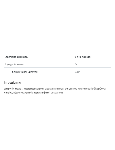 ІНГРЕДІЄНТИ Цитрулін Зміст на одну порцію зміст: Цитрулін малат 5 г - з них цитрулін 2,8 г