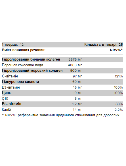 Окрім яловичого та рибного колагену, наш продукт також містить велику кількість порошку кокосової води, а також гіалуронову кислоту та Q10.