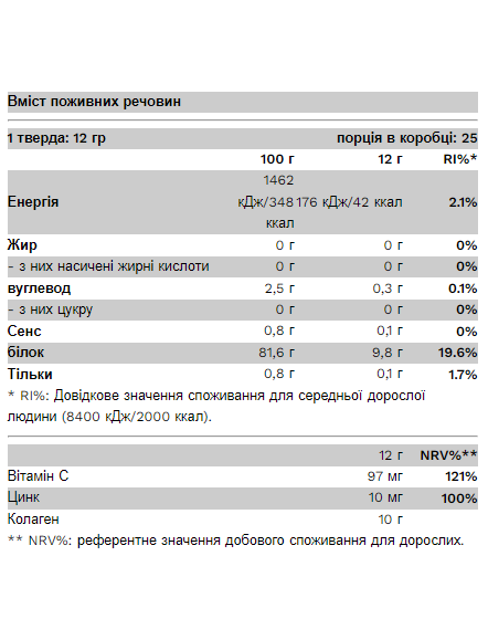 Склад: гідролізований яловичий колаген, лимонна кислота, ароматизатор, підсолоджувачі (ацесульфам-К, сукралоза), аскорбінова кислота, хлорид натрію, барвник, оксид цинку.