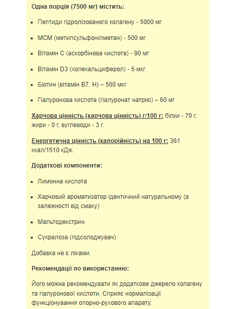Харчова добавка Stark Pharm - Stark Collagen Peptides & Hyaluronic Acid - це комплекс, який містить колаген і гіалуронову кислоту в якості основи, доповнений рядом вітамінів. Склад добавки сприяє нормалізації роботи опорно-рухового апарату, є додатковим джерелом колагену та гіалуронової кислоти. Саме наявність додаткових компонентів, таких як вітаміни С і D3, біотин, МСМ (метилсульфонілметан), максимально посилюють дію основних компонентів добавки, і саме завдяки цьому наш організм отримує максимальну користь від використання комплексу.