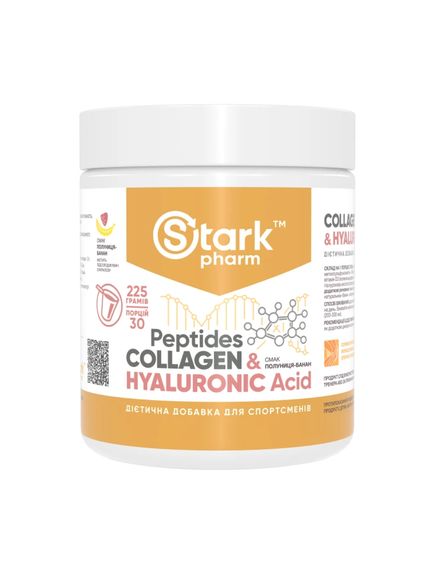 Харчова добавка Stark Pharm - Stark Collagen Peptides & Hyaluronic Acid - це комплекс, який містить колаген і гіалуронову кислоту в якості основи, доповнений рядом вітамінів. Склад добавки сприяє нормалізації роботи опорно-рухового апарату, є додатковим джерелом колагену та гіалуронової кислоти. Саме наявність додаткових компонентів, таких як вітаміни С і D3, біотин, МСМ (метилсульфонілметан), максимально посилюють дію основних компонентів добавки, і саме завдяки цьому наш організм отримує максимальну користь від використання комплексу.