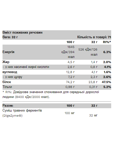Список інгредієнтів (Belgian Chocolate – зі смаком бельгійського шоколаду): концентрат сироваткового протеїну ( з молока , інстантизований соняшниковим лецитином), концентрат молочної сироватки з мікрофільтром ( з молока ), L-гліцин, сухе знежирене молоко . , мальтодекстрин, какао-порошок зі зниженим вмістом жиру, ароматизатори (шоколадний смак, вершковий смак), хлорид натрію, загусник (ксантанова камедь), L-таурин, L-глутамін, підсолоджувачі (ацесульфам К, сукралоза), ферментний комплекс Digezyme® (альфа- амілаза, нейтральна протеаза, целюлаза, лактаза, ліпаза).