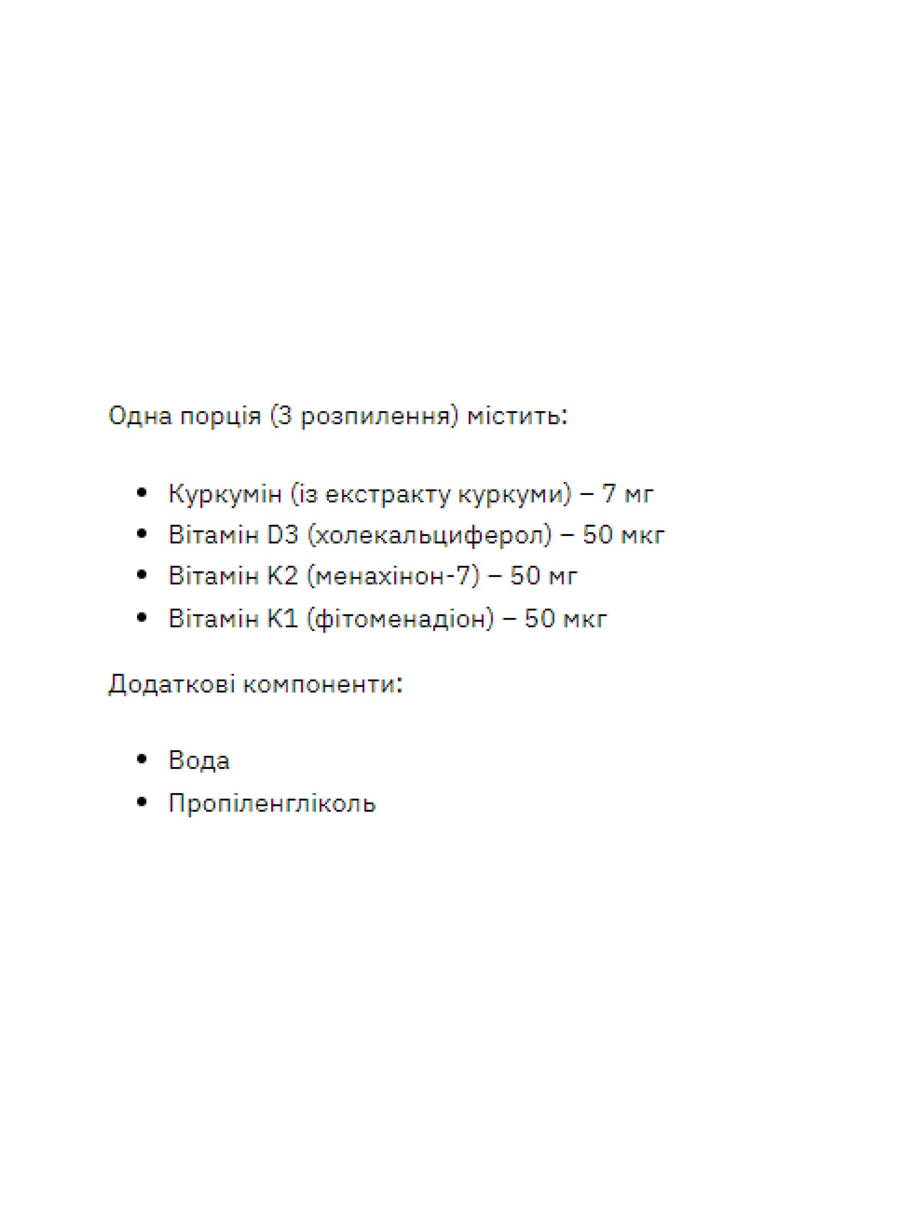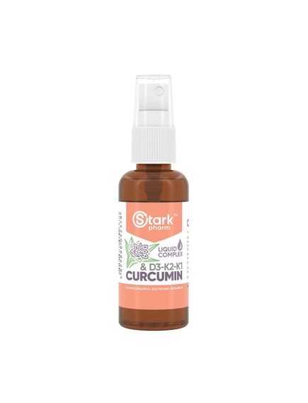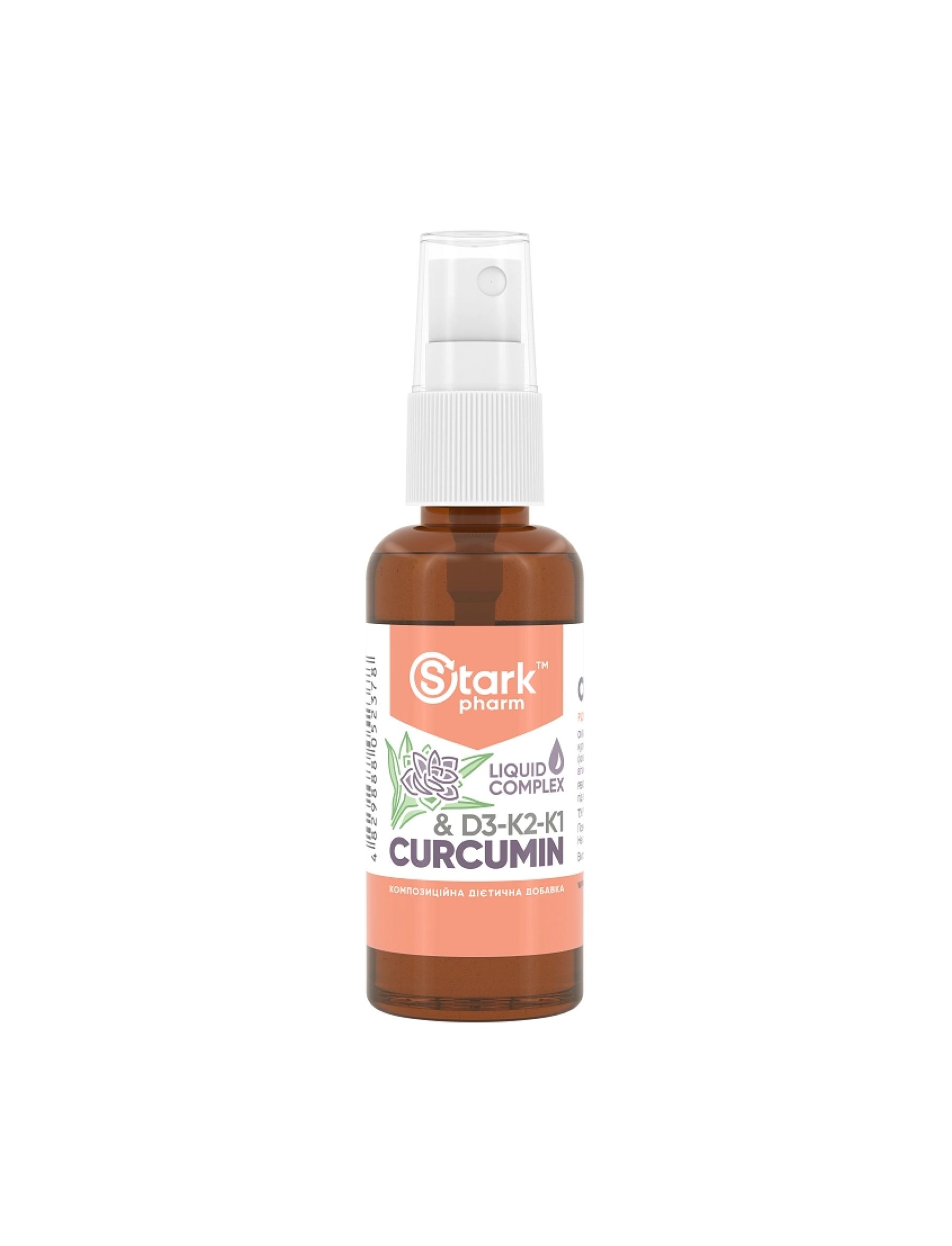 Спрей Stark Curcumin & D3-K2-K1 Liquid Complex містить комплекс вітамінів D3, K2 і K1, доповнений рідким екстрактом куркуміну для кращого засвоєння.