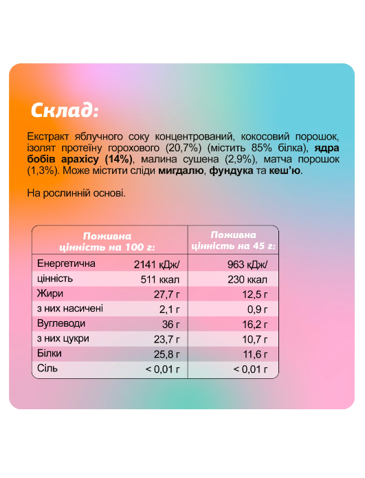 Склад: екстракт яблучного соку концентрований, кокосовий порошок, ізолят протеїну горохового (20,7%) (містить 85% білка), ядра бобів арахісу (14%), малина сушена (2,9%), матча порошок (1,3%).
